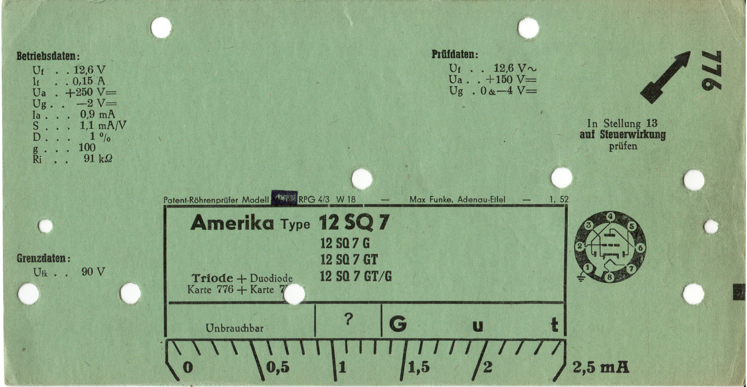 12 SQ 7 | 776 + 777 | #1: Funke-Prüfkartenverzeichnis vom 1.3.57 | Amerika-Röhrentypen | |