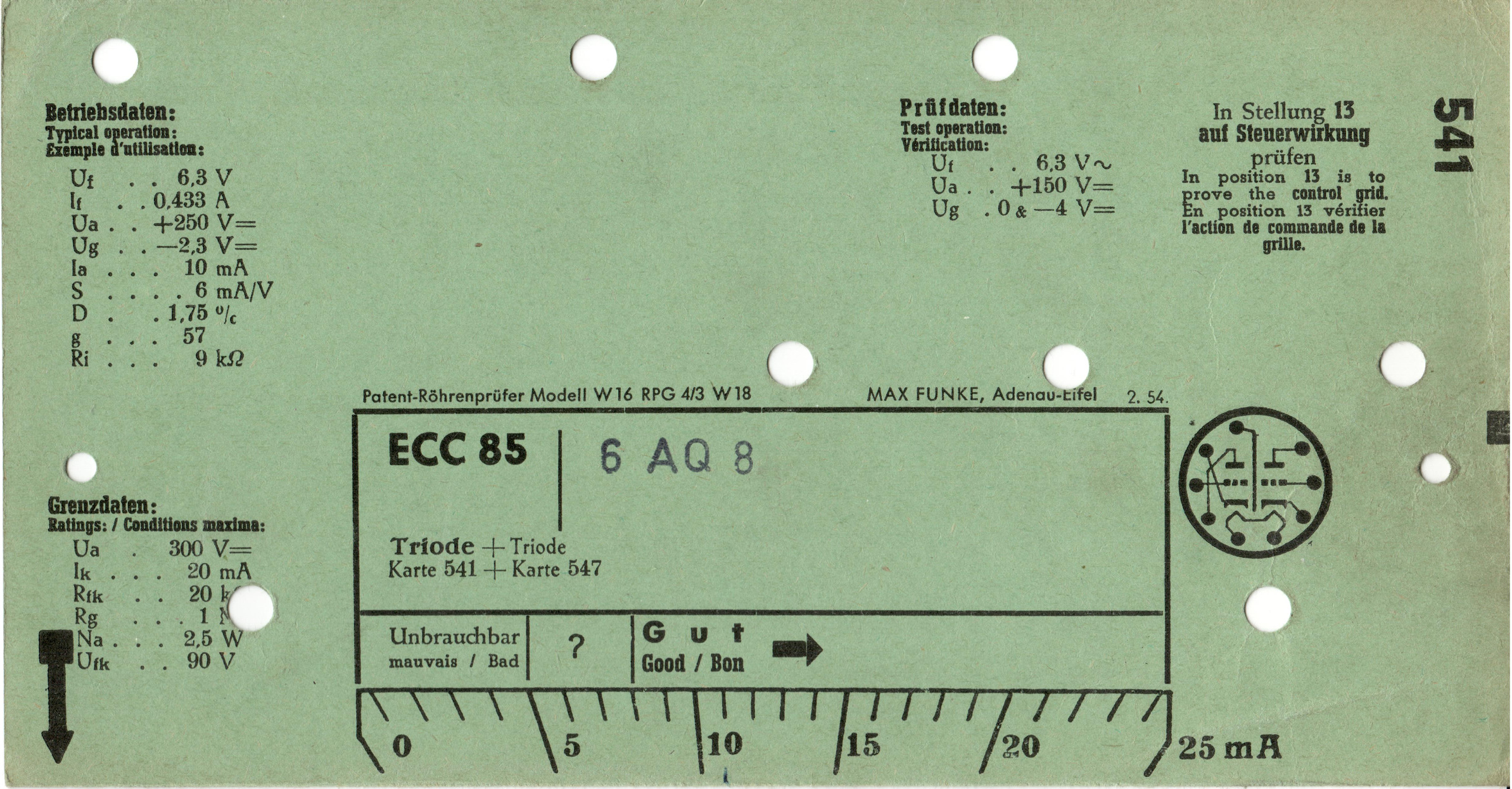 ECC 85 | 541 + 547 | #1: Funke-Prüfkartenverzeichnis vom 1.3.57 | Europa-Röhrentypen | |