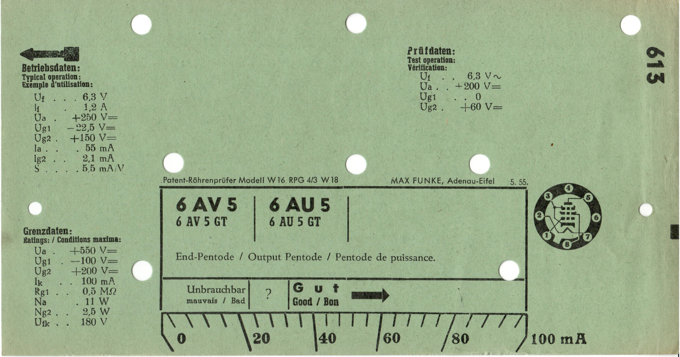 6 AV 5 GA | 613 | #6: Röhren- und Prüfkarten-Verzeichnis zum Patent-Röhrenmeßgerät „Blaues Buch“ | Amerika | |