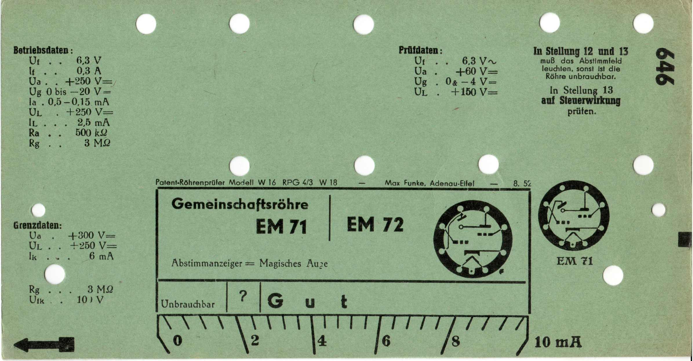 EM 71 | 646 | #1: Funke-Prüfkartenverzeichnis vom 1.3.57 | Europa-Röhrentypen | |