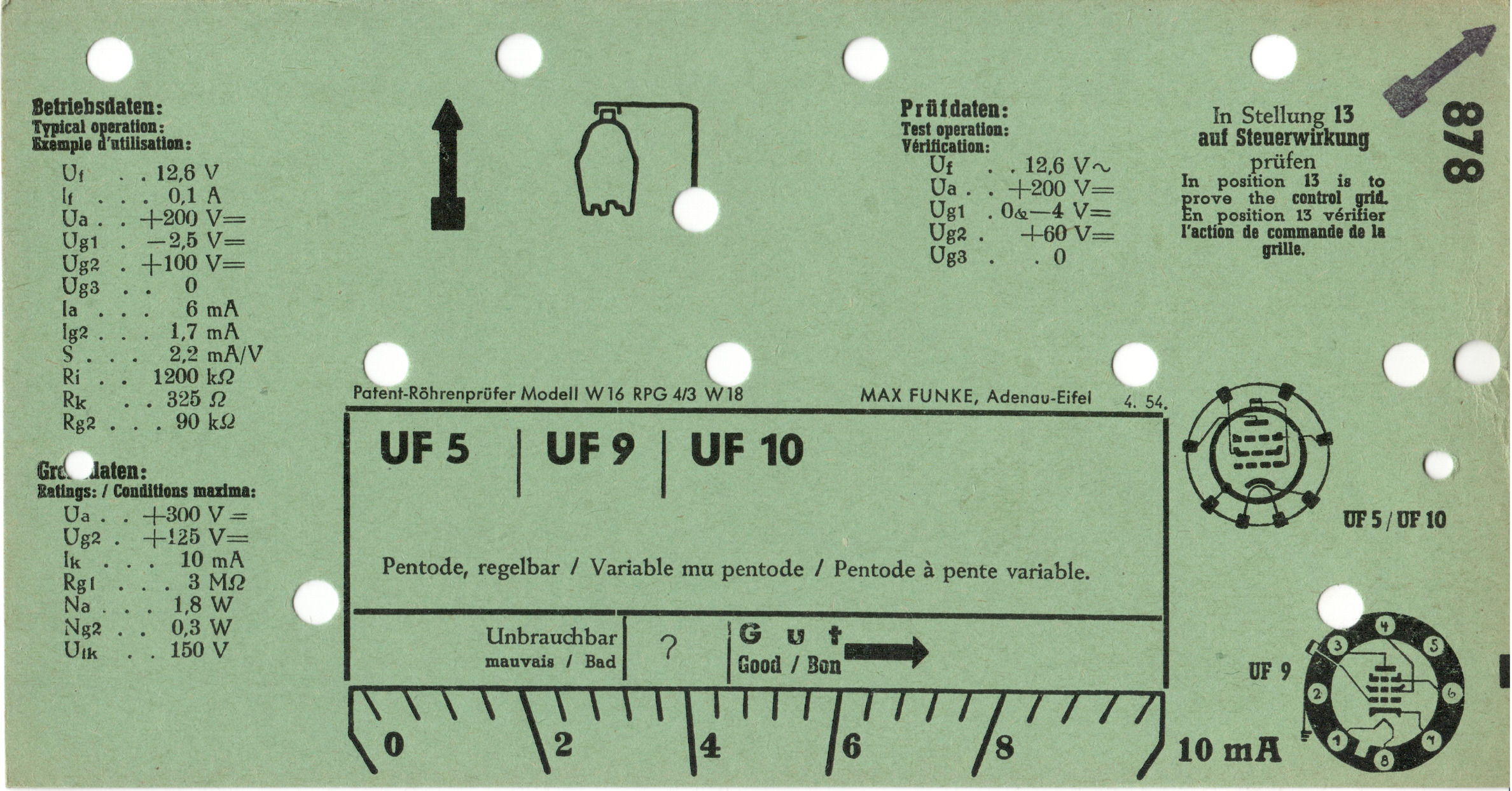 UF 9 | 878 | #1: Funke-Prüfkartenverzeichnis vom 1.3.57 | Europa-Röhrentypen | |