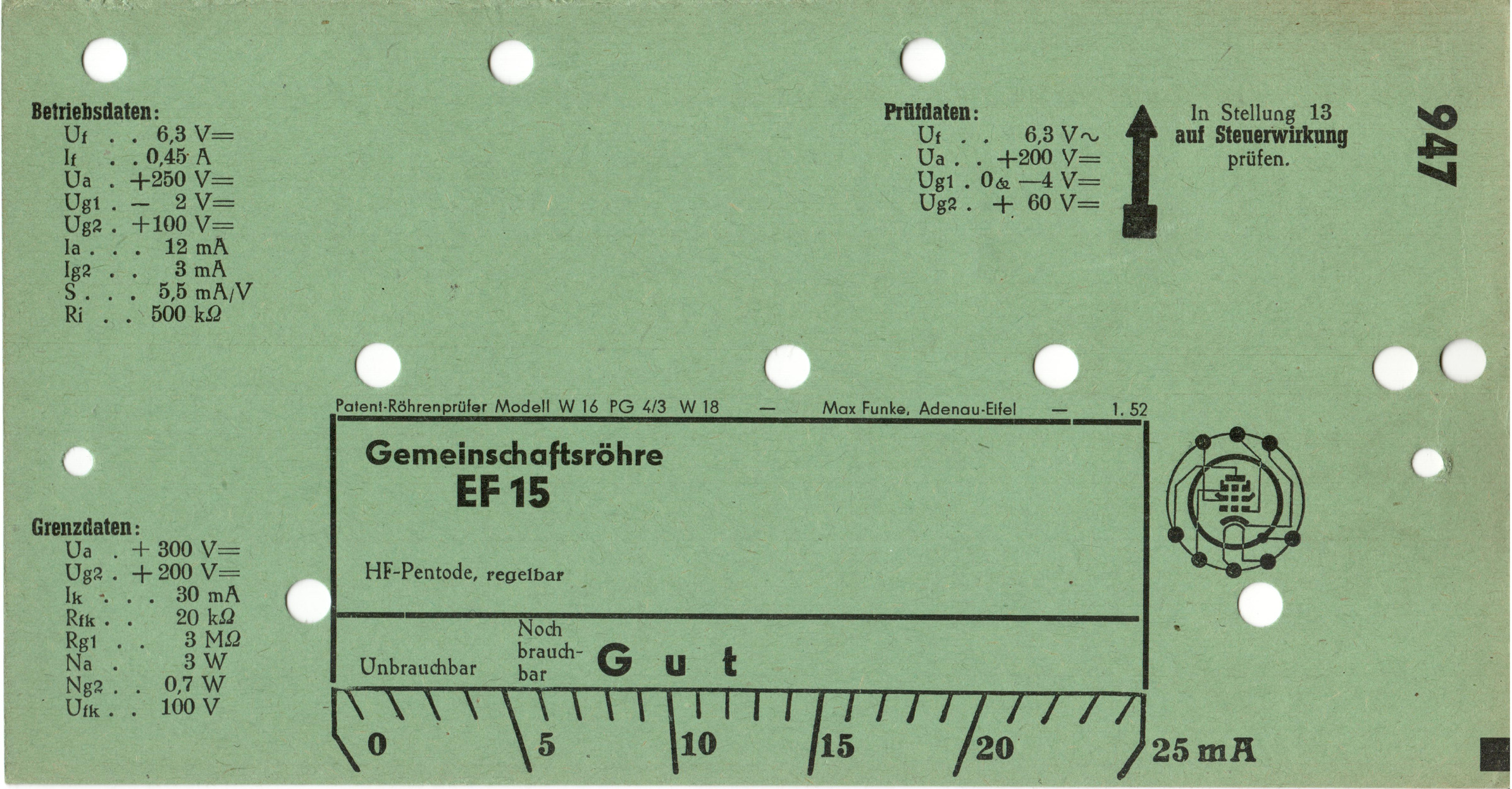 EF 15 | 947 | #1: Funke-Prüfkartenverzeichnis vom 1.3.57 | Europa-Röhrentypen |