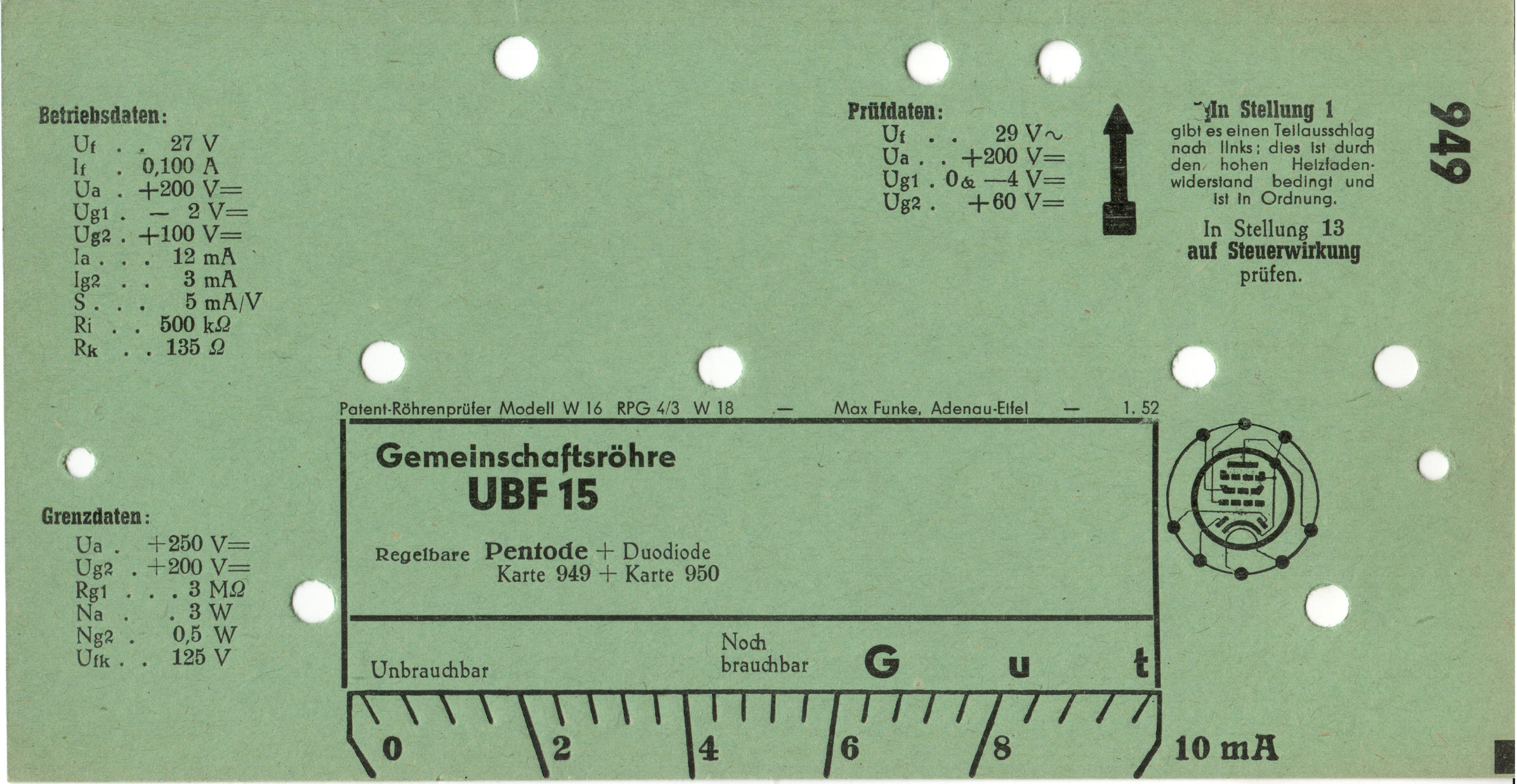 UBF 15 | 949 + 950 | #1: Funke-Prüfkartenverzeichnis vom 1.3.57 | Europa-Röhrentypen |