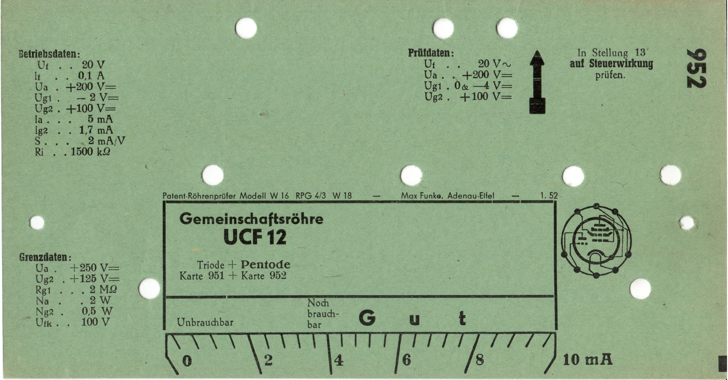 UCF 12 | 951 + 952 | #1: Funke-Prüfkartenverzeichnis vom 1.3.57 | Europa-Röhrentypen |