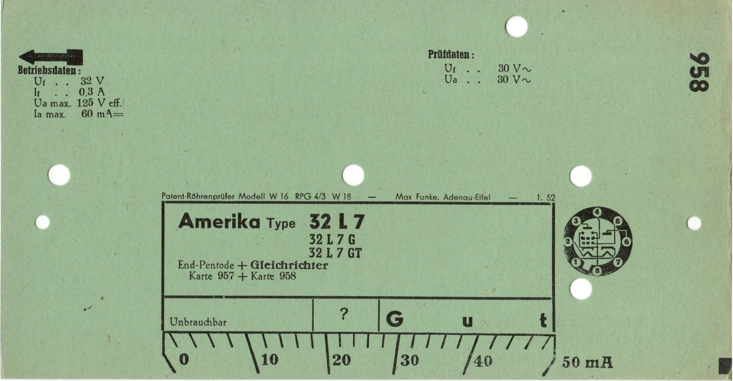 32 L 7 | 957 + 958 | #1: Funke-Prüfkartenverzeichnis vom 1.3.57 | Amerika-Röhrentypen | |