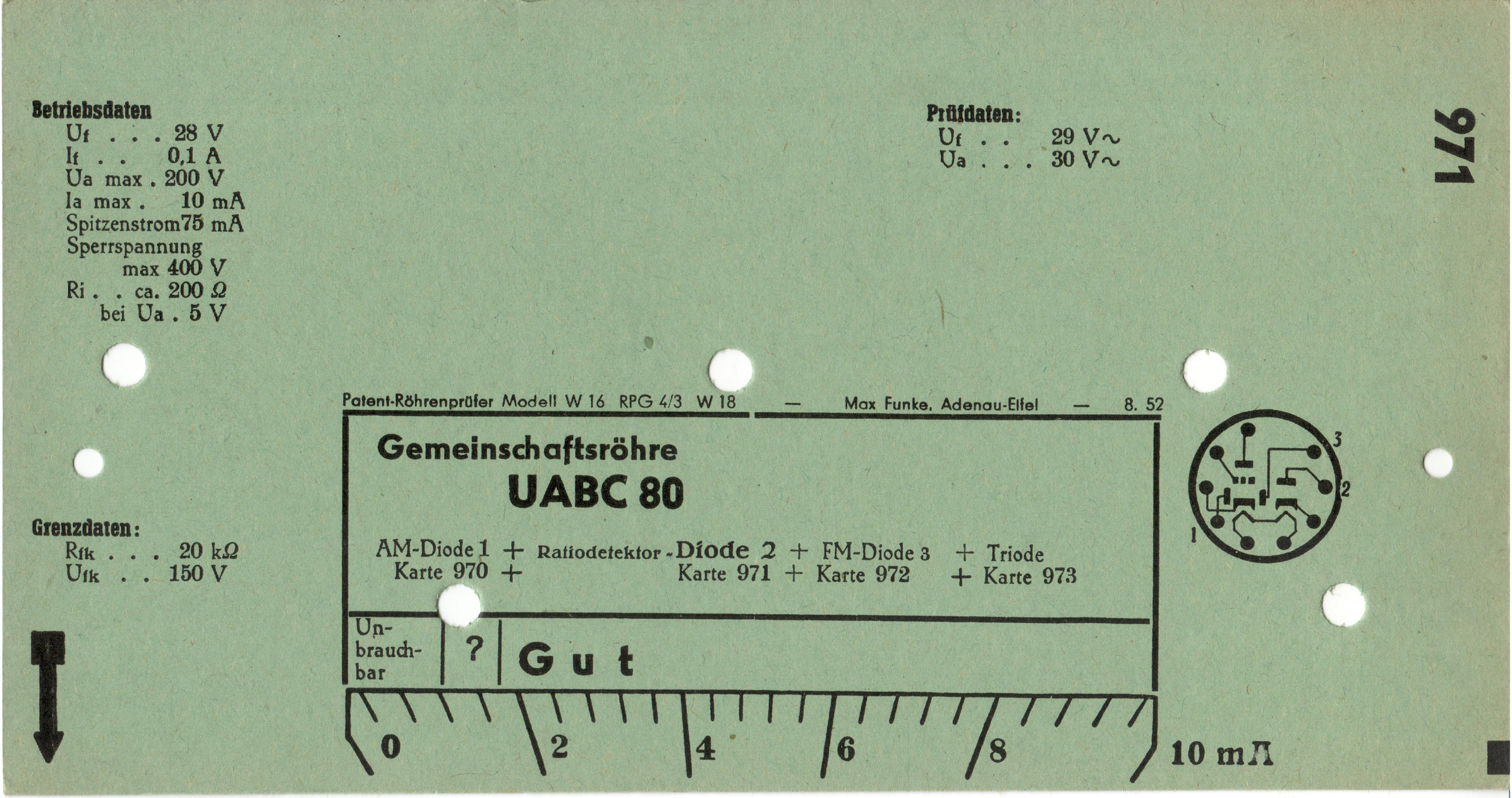 UABC 80 | 970 + 971 + 972 + 973 | #1: Funke-Prüfkartenverzeichnis vom 1.3.57 | Europa-Röhrentypen | |