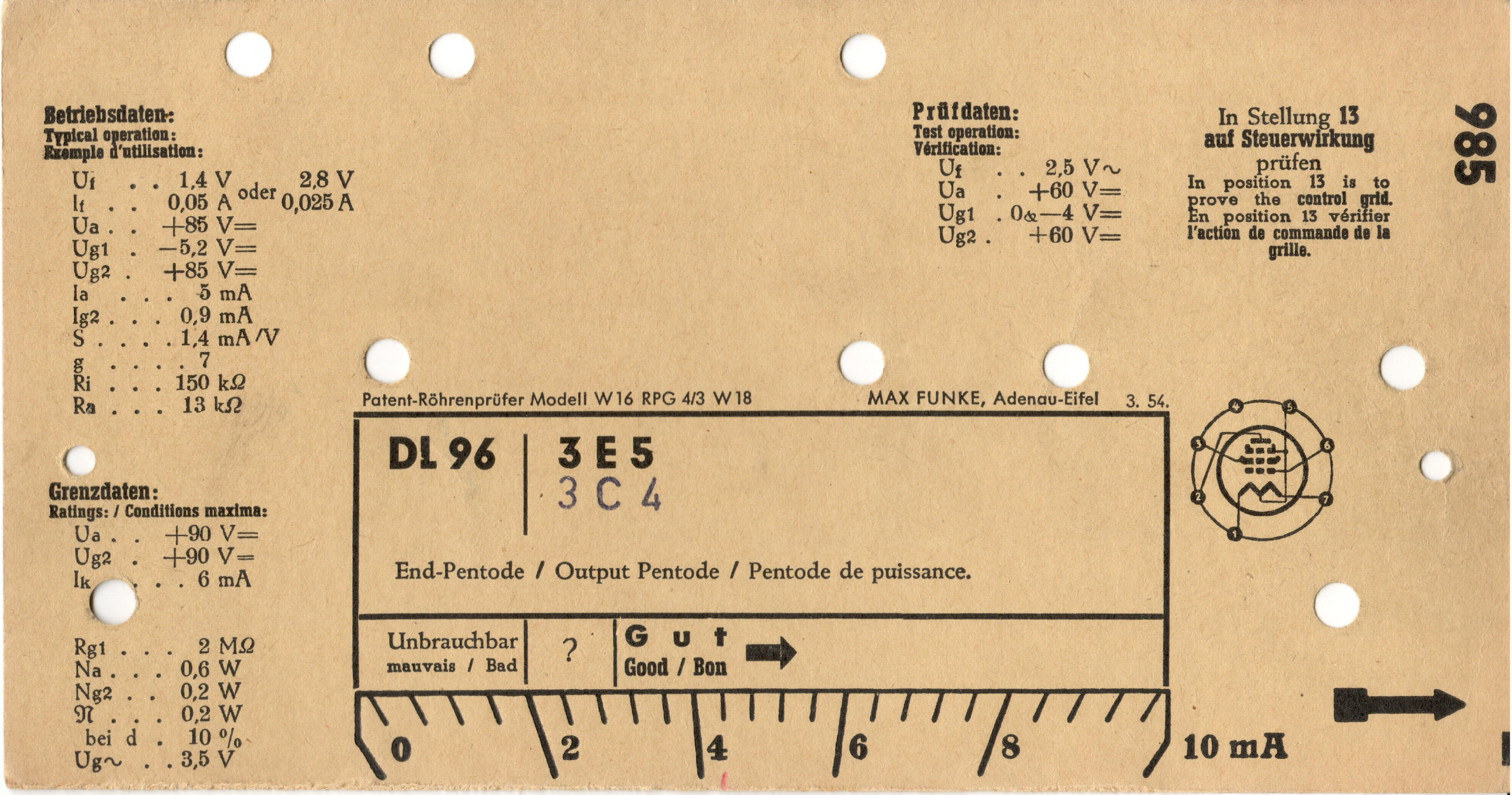 DL 96 | 985 | #1: Funke-Prüfkartenverzeichnis vom 1.3.57 | Europa-Röhrentypen | |