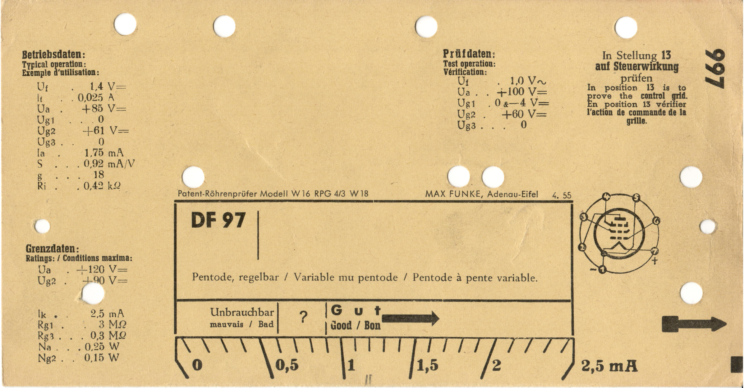 DF 97 | 997 | #1: Funke-Prüfkartenverzeichnis vom 1.3.57 | Europa-Röhrentypen | |