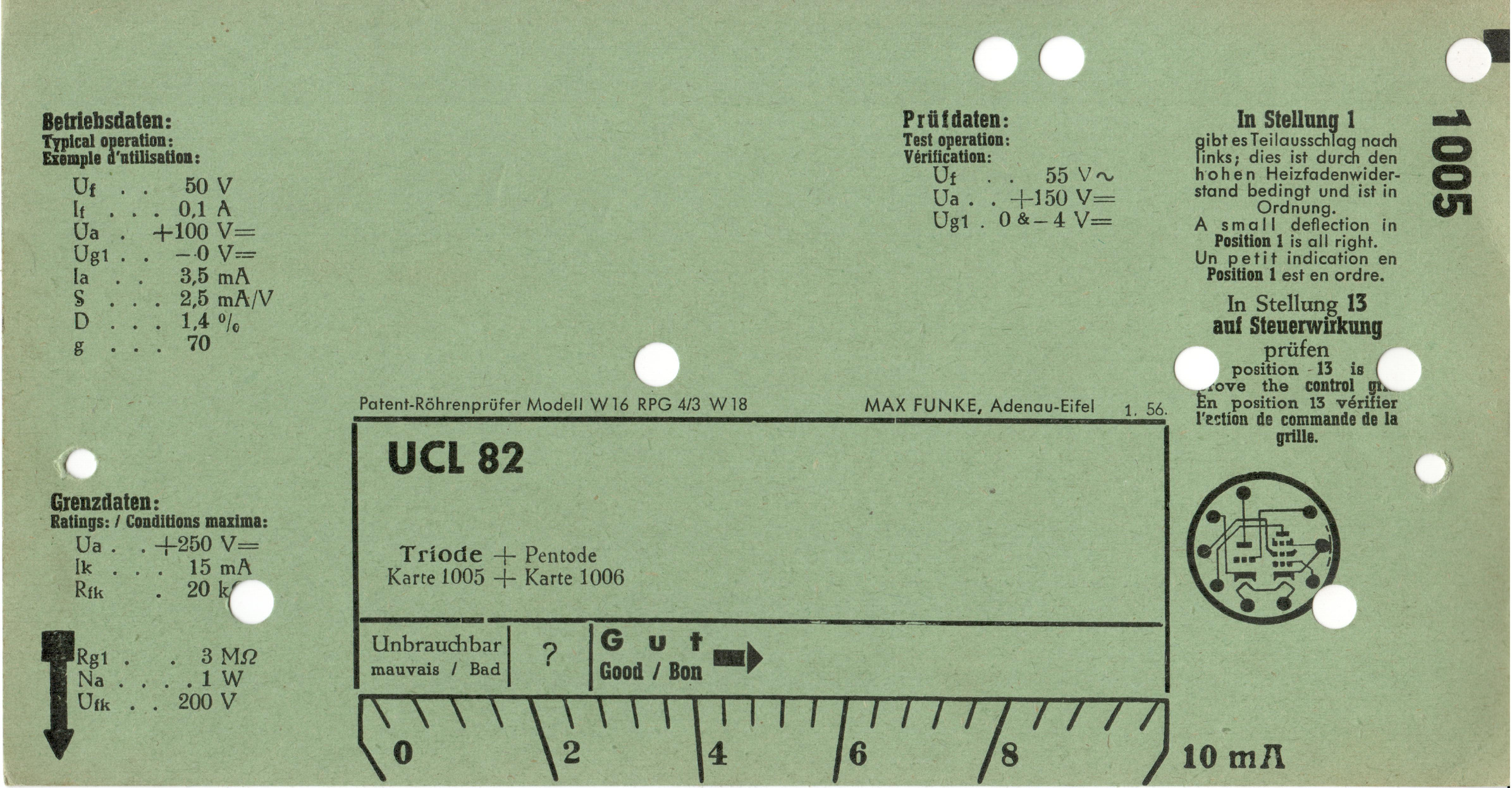 UCL 82 | 1005 + 1006 | #1: Funke-Prüfkartenverzeichnis vom 1.3.57 | Europa-Röhrentypen | |