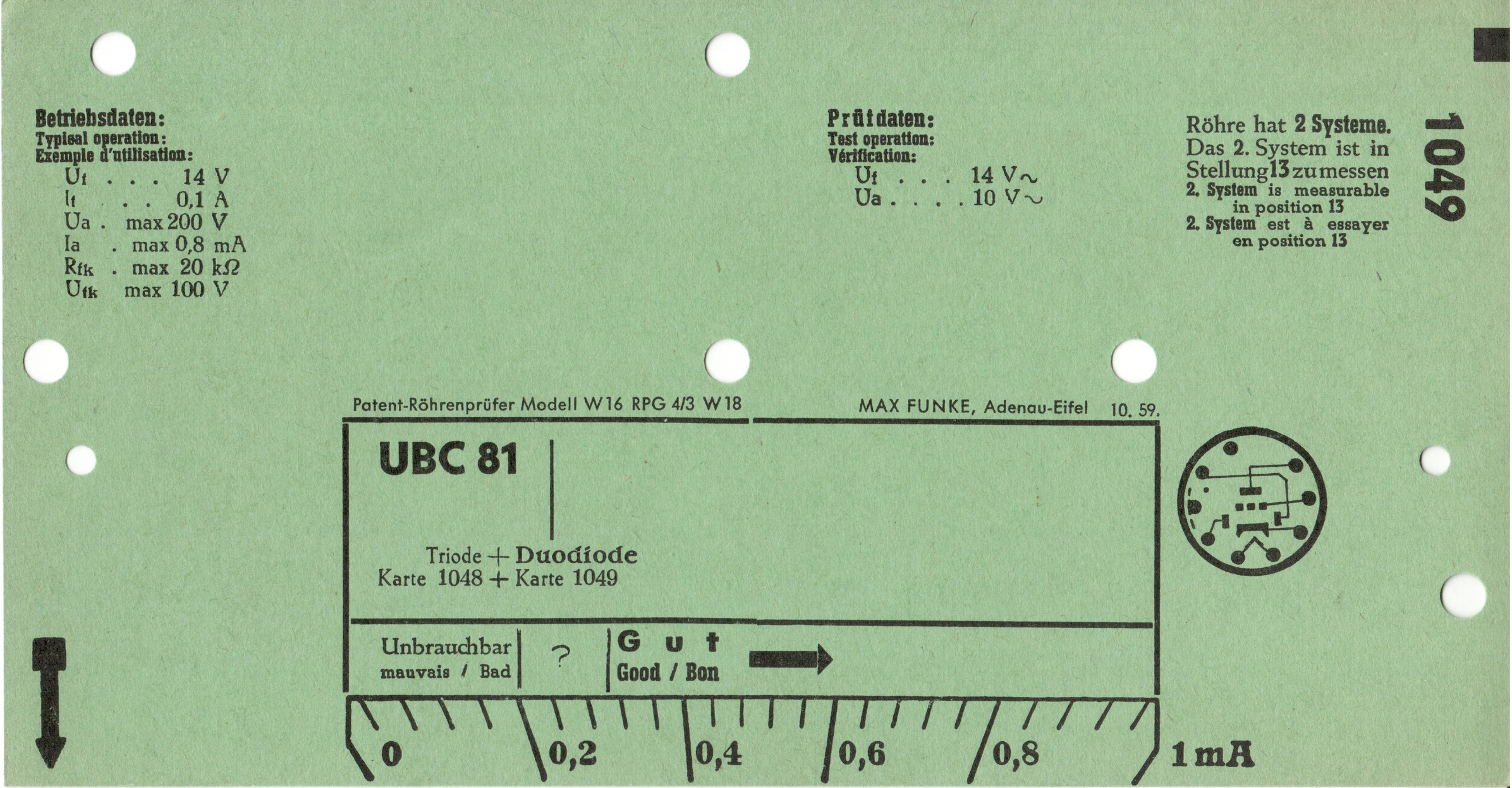 10 LD 13 | 1048 + 1049 | #6: Röhren- und Prüfkarten-Verzeichnis zum Patent-Röhrenmeßgerät „Blaues Buch“ | Mazda | |