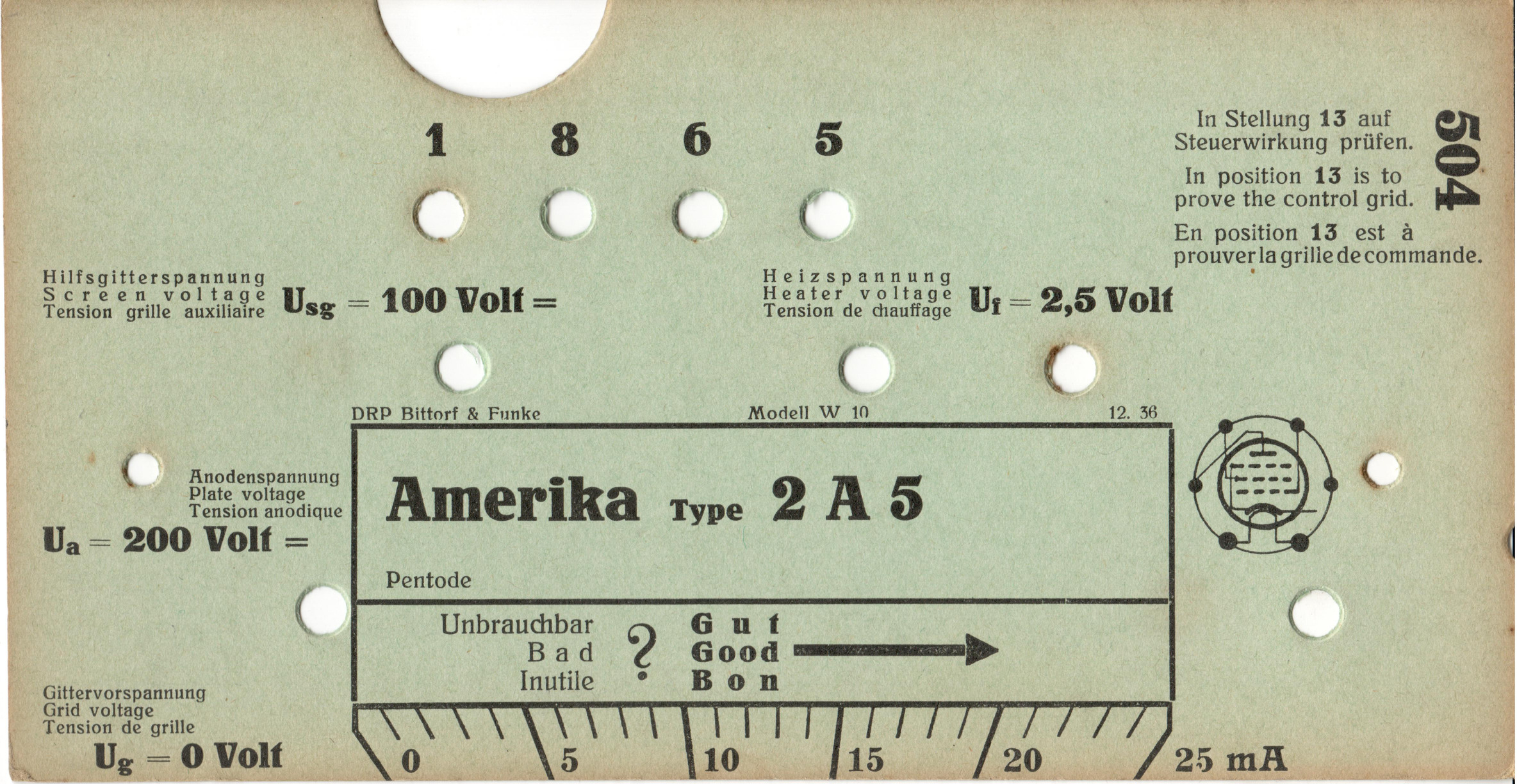 2 A 5 | 504 | #1: Funke-Prüfkartenverzeichnis vom 1.3.57 | Amerika-Röhrentypen | |