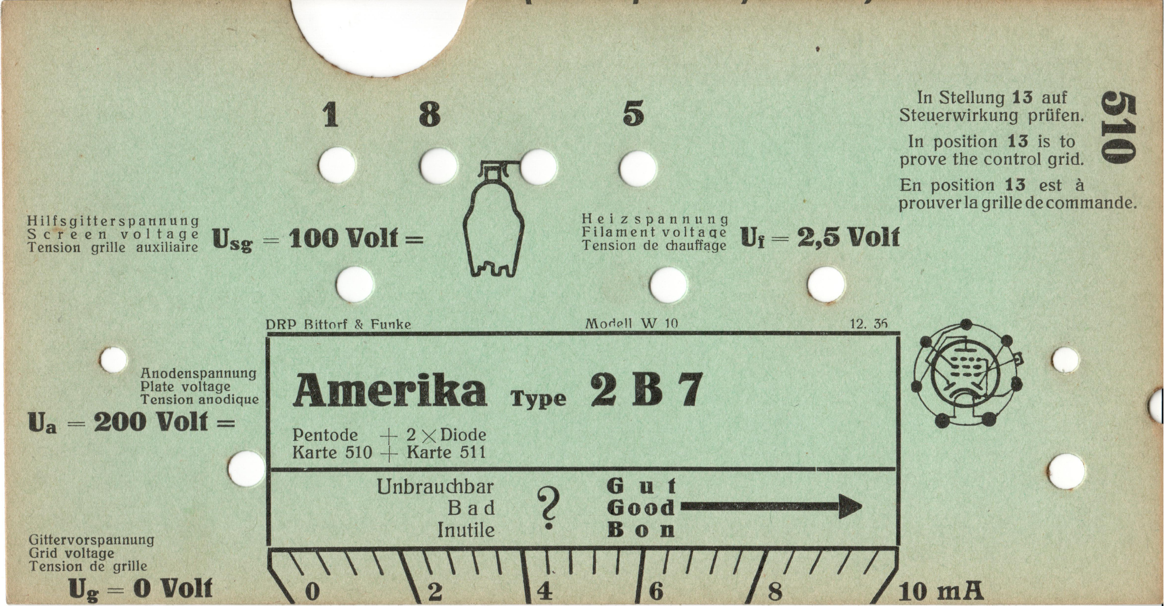 2 B 7 | 510 + 555 | #1: Funke-Prüfkartenverzeichnis vom 1.3.57 | Amerika-Röhrentypen | |
