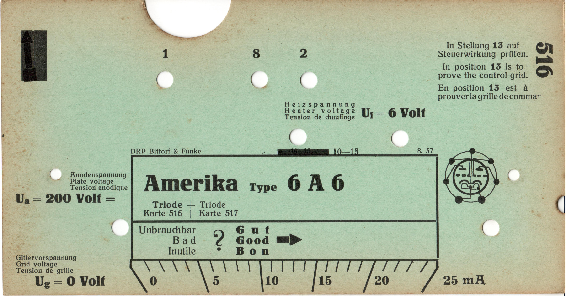 Auf älteren Karten wird die 6A6 mit 200 V= geprüft, auf neueren hingegen mit 150 V=, daher Aufdruck der Karte und Lochung kontrollieren. Bei 200 V= wird die maximale Belastbarkeit der Anode überschritten. Bei Ua=150 V beginnt „gut“ ab 4,8 mA.
