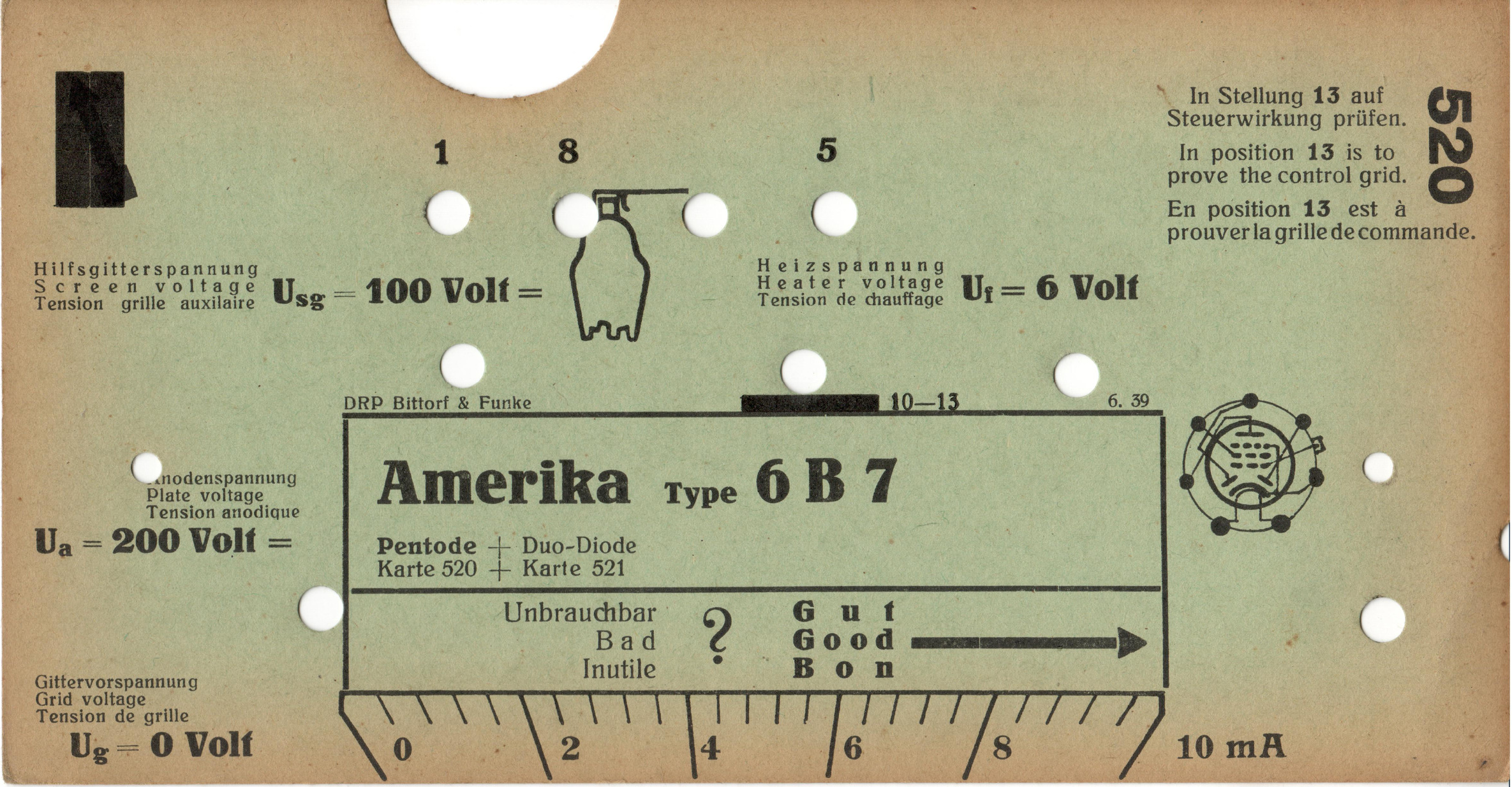 6 B 7 | 520 + 521 | #1: Funke-Prüfkartenverzeichnis vom 1.3.57 | Amerika-Röhrentypen | |