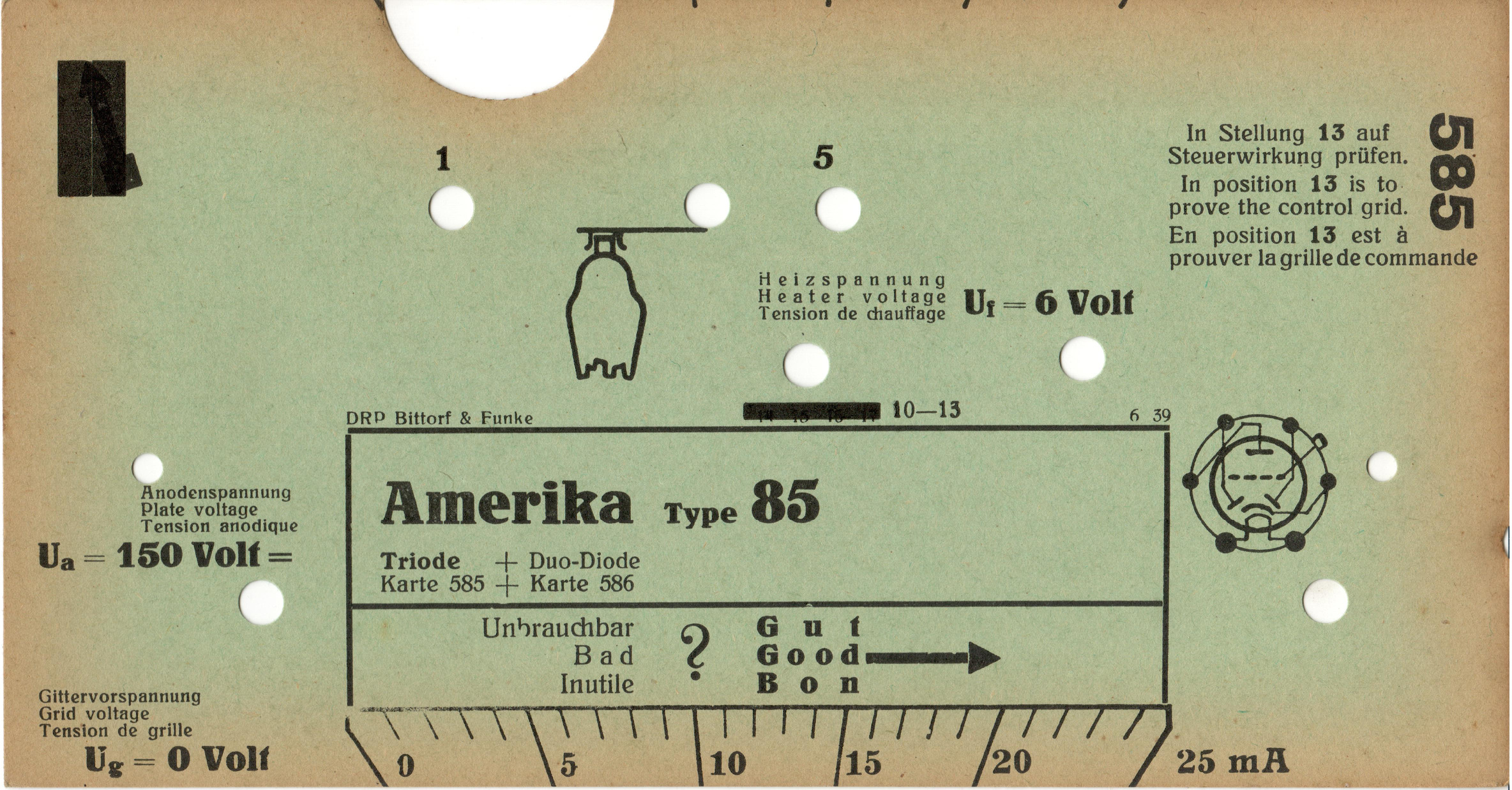 85 | 585 + 601 | #1: Funke-Prüfkartenverzeichnis vom 1.3.57 | Amerika-Röhrentypen | |