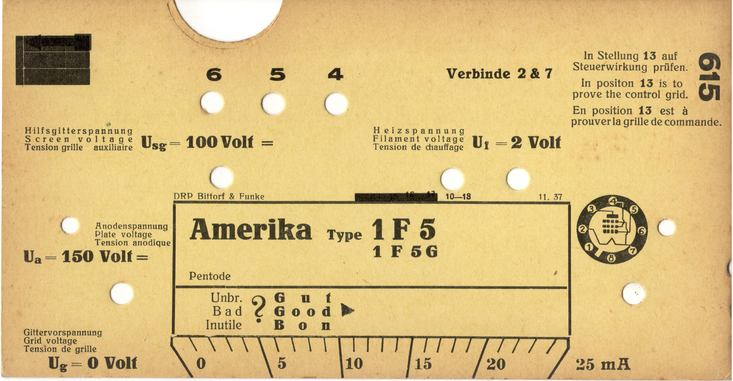 1 F 5 GT | 615 | #6: Röhren- und Prüfkarten-Verzeichnis zum Patent-Röhrenmeßgerät „Blaues Buch“ | Amerika | |