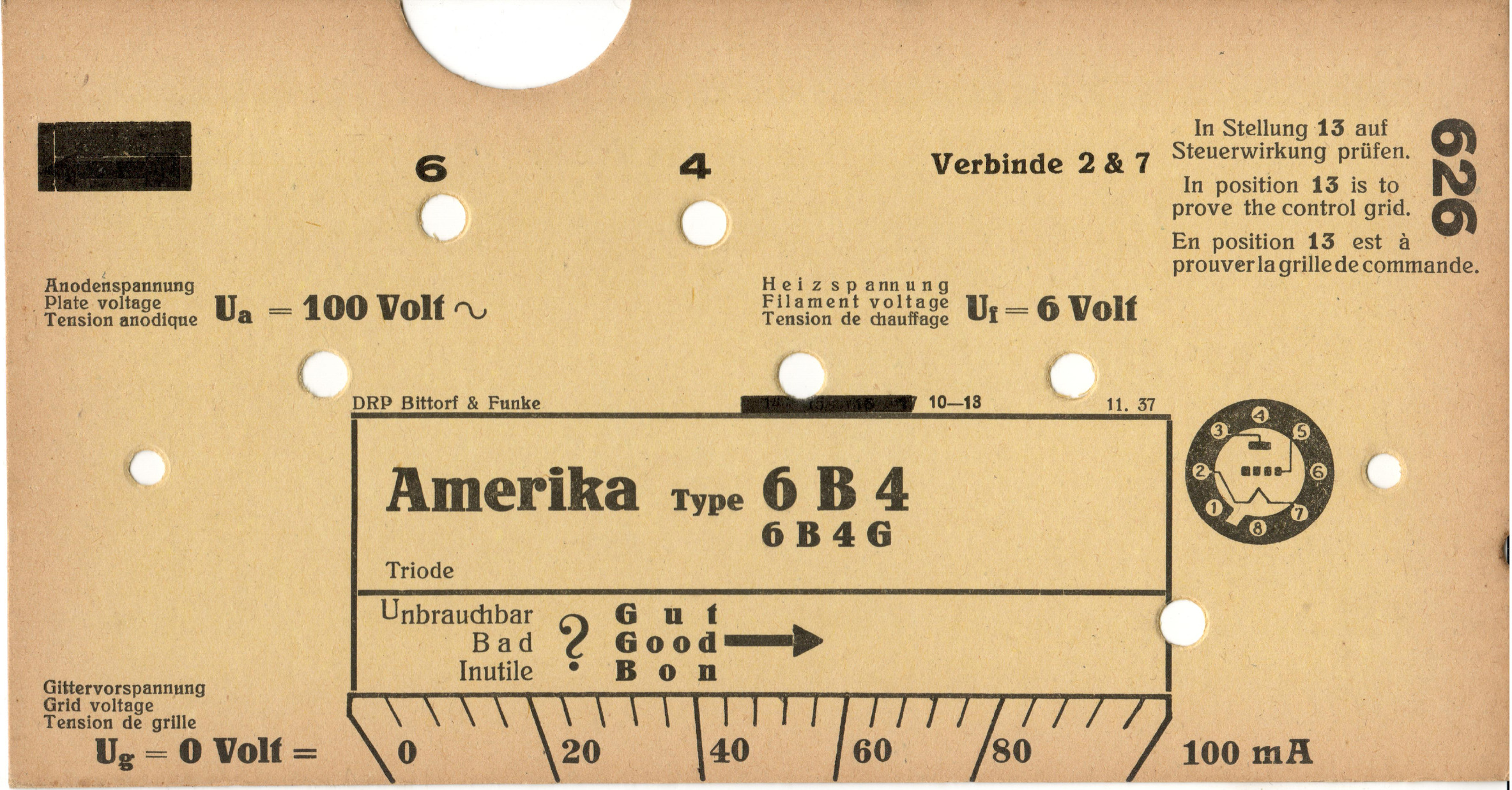 6 B 4 G | 626 | #6: Röhren- und Prüfkarten-Verzeichnis zum Patent-Röhrenmeßgerät „Blaues Buch“ | Amerika | |