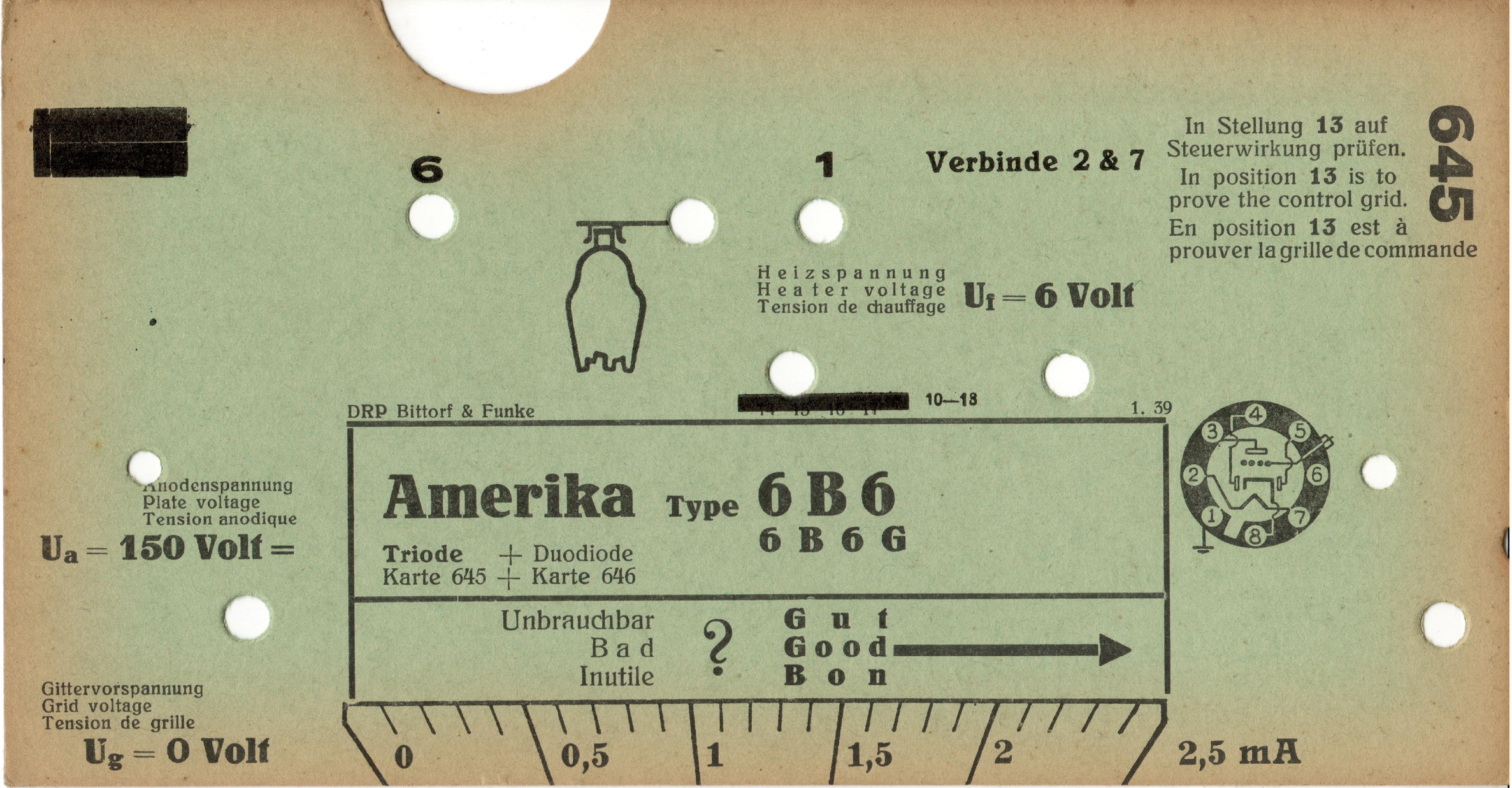 6 B 6 | 603 + 645 | #1: Funke-Prüfkartenverzeichnis vom 1.3.57 | Amerika-Röhrentypen | |