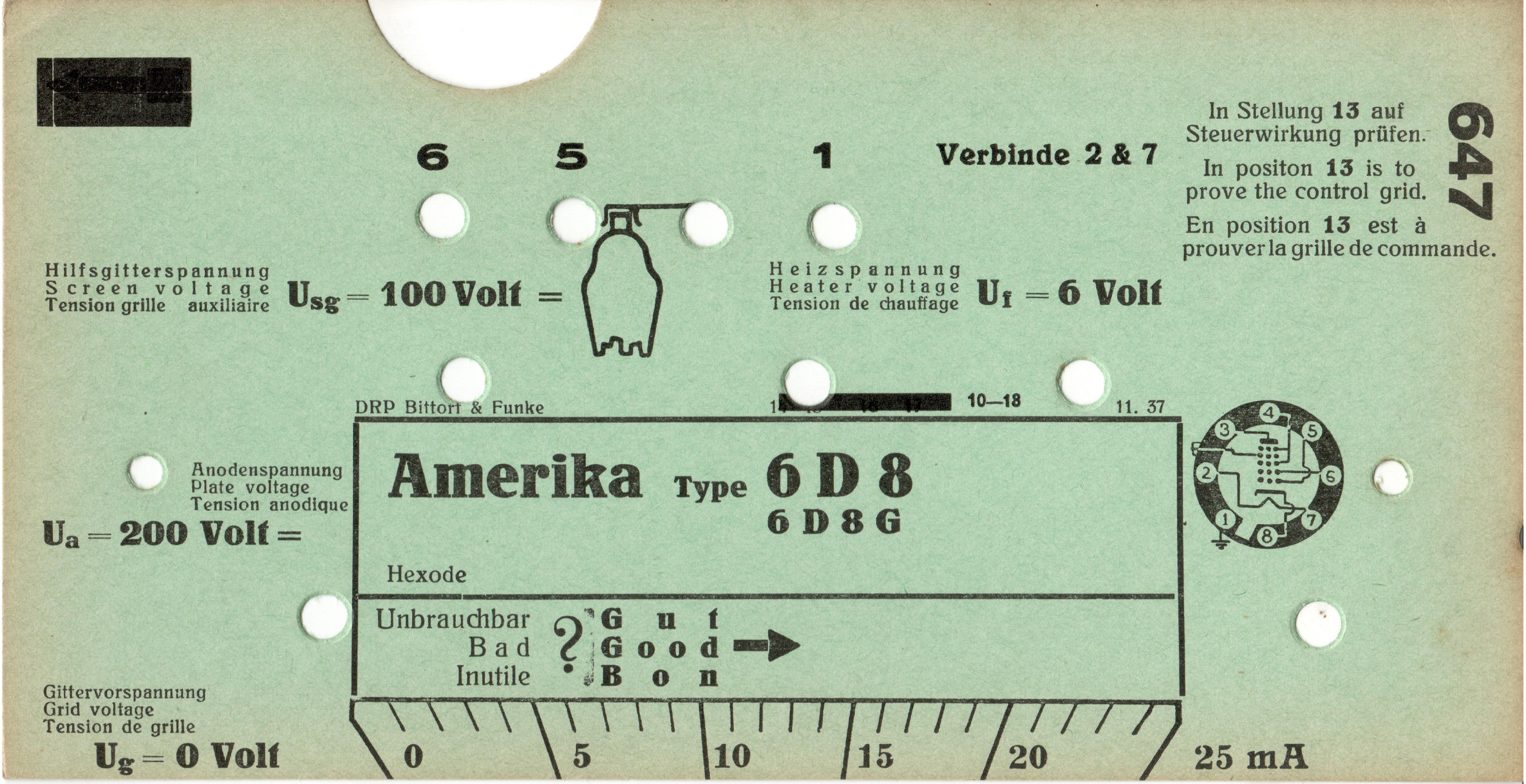 6 D 8 | 647 | #1: Funke-Prüfkartenverzeichnis vom 1.3.57 | Amerika-Röhrentypen | |