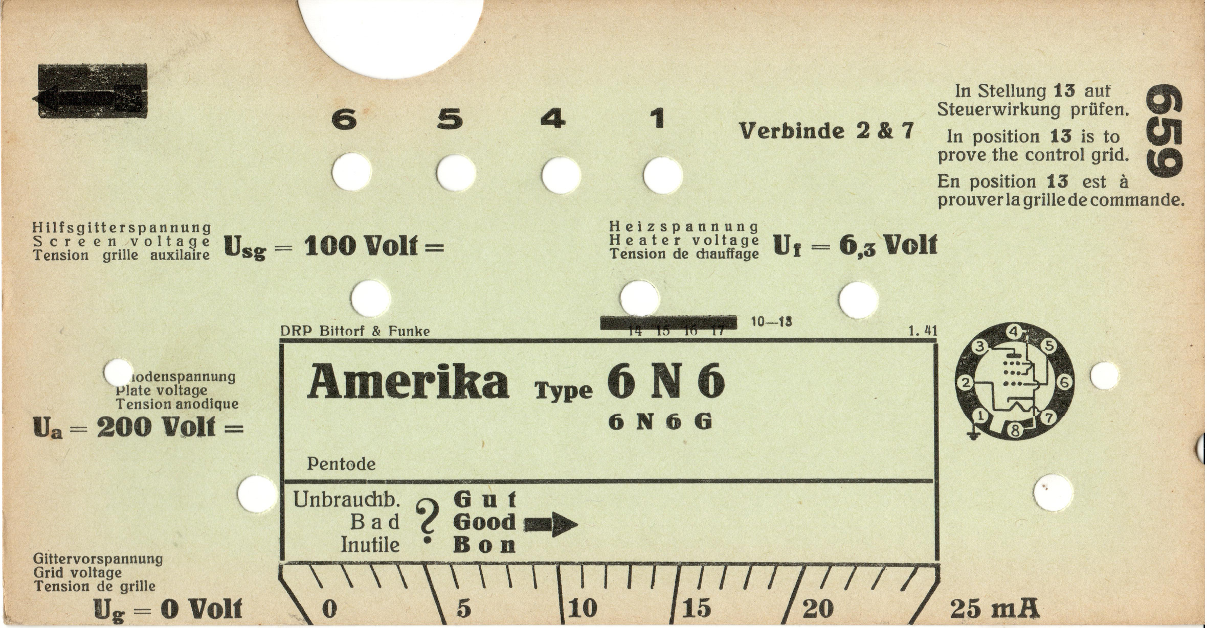 6 N 6 | 659 + 733 | #1: Funke-Prüfkartenverzeichnis vom 1.3.57 | Amerika-Röhrentypen | |
