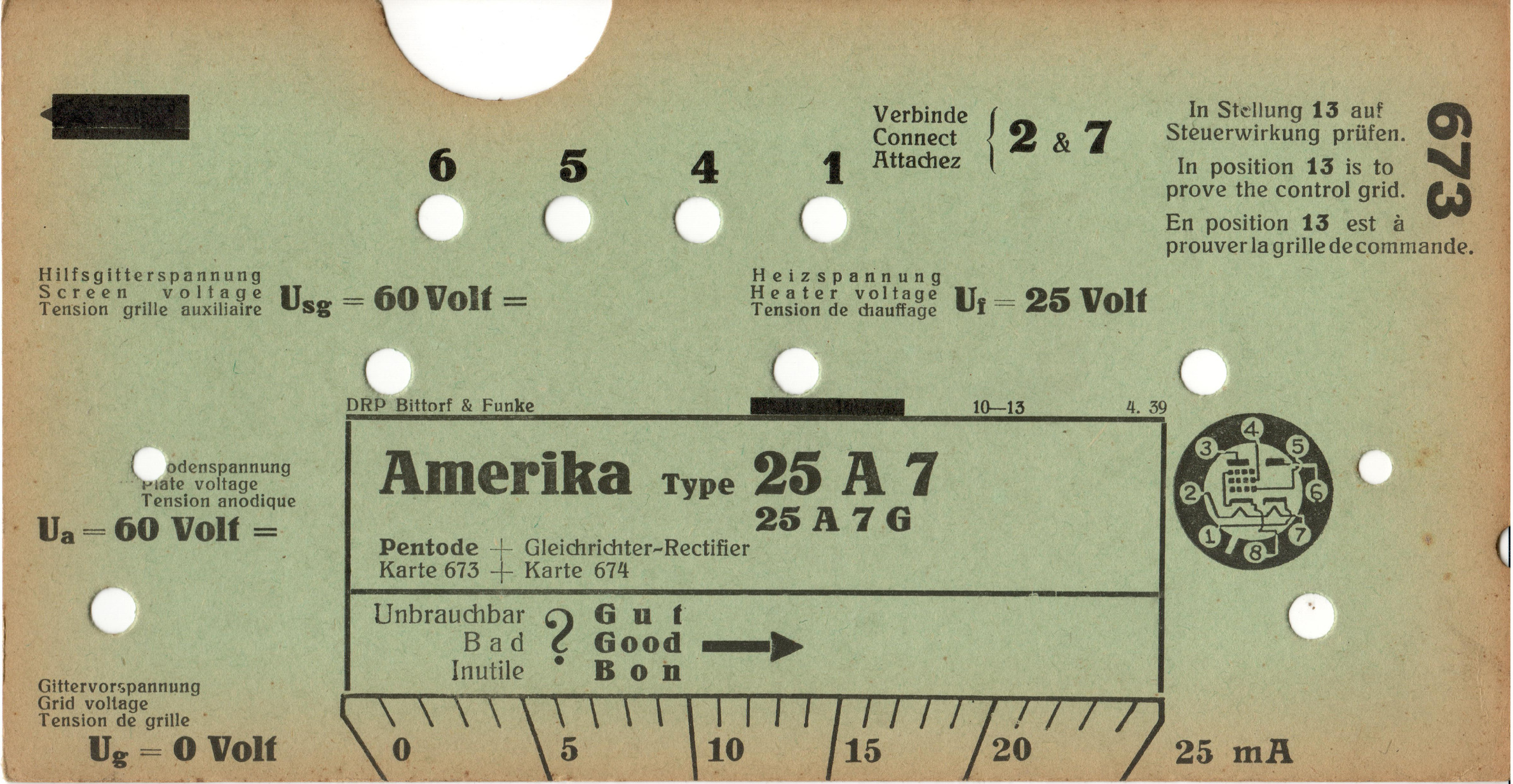 25 A 7 | 673 + 674 | #1: Funke-Prüfkartenverzeichnis vom 1.3.57 | Amerika-Röhrentypen | |