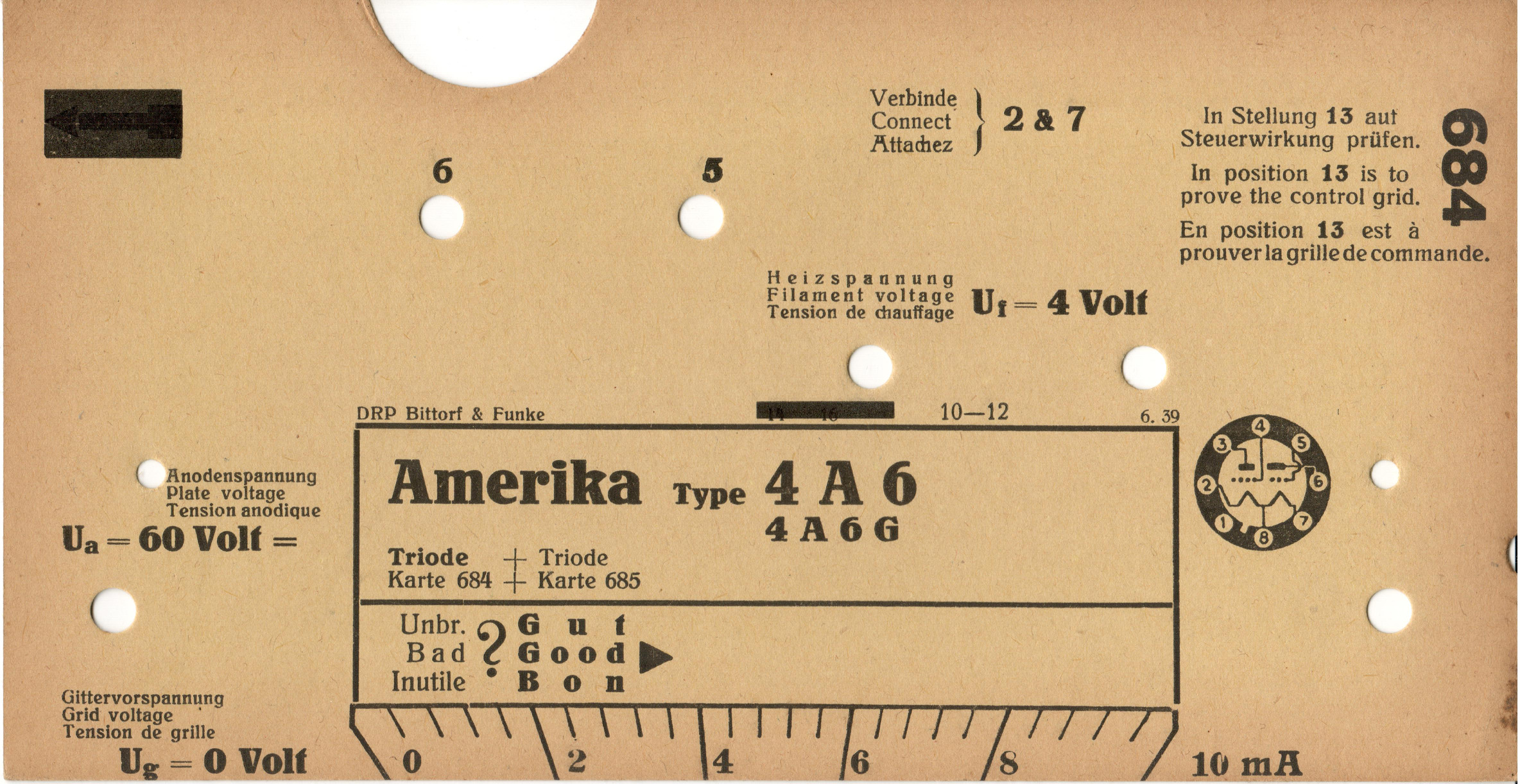 4 A 6 | 684 + 685 | #1: Funke-Prüfkartenverzeichnis vom 1.3.57 | Amerika-Röhrentypen | |