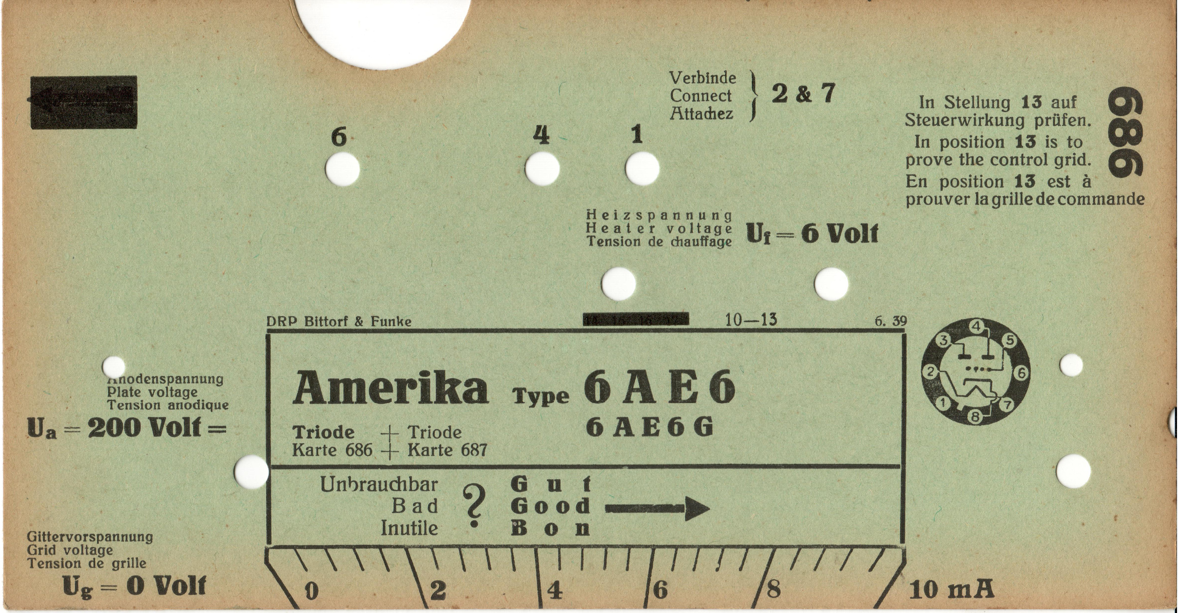 6 AE 6 | 686 + 687 | #1: Funke-Prüfkartenverzeichnis vom 1.3.57 | Amerika-Röhrentypen |