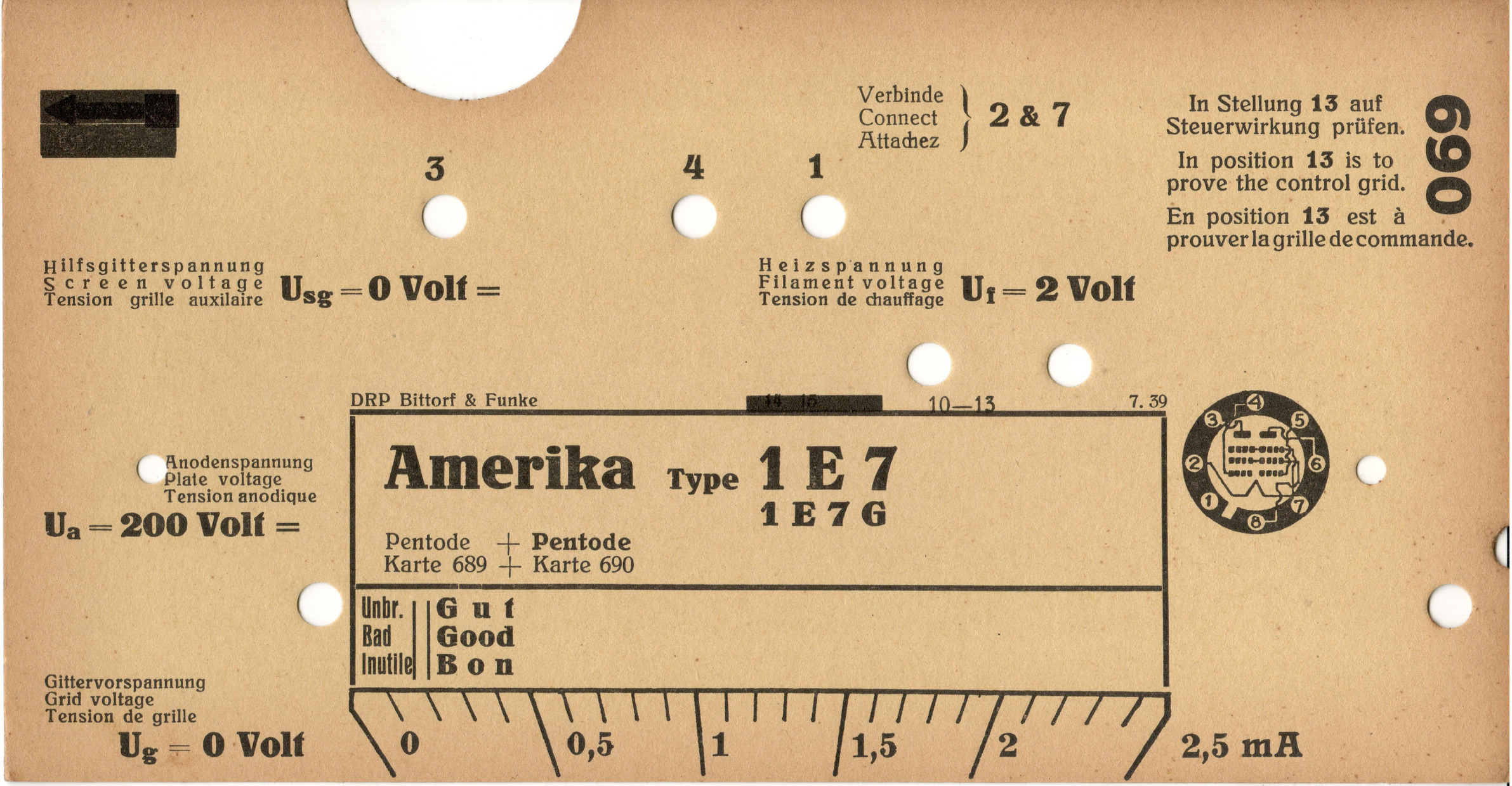 1 E 7 | 689 + 690 | #1: Funke-Prüfkartenverzeichnis vom 1.3.57 | Amerika-Röhrentypen | |