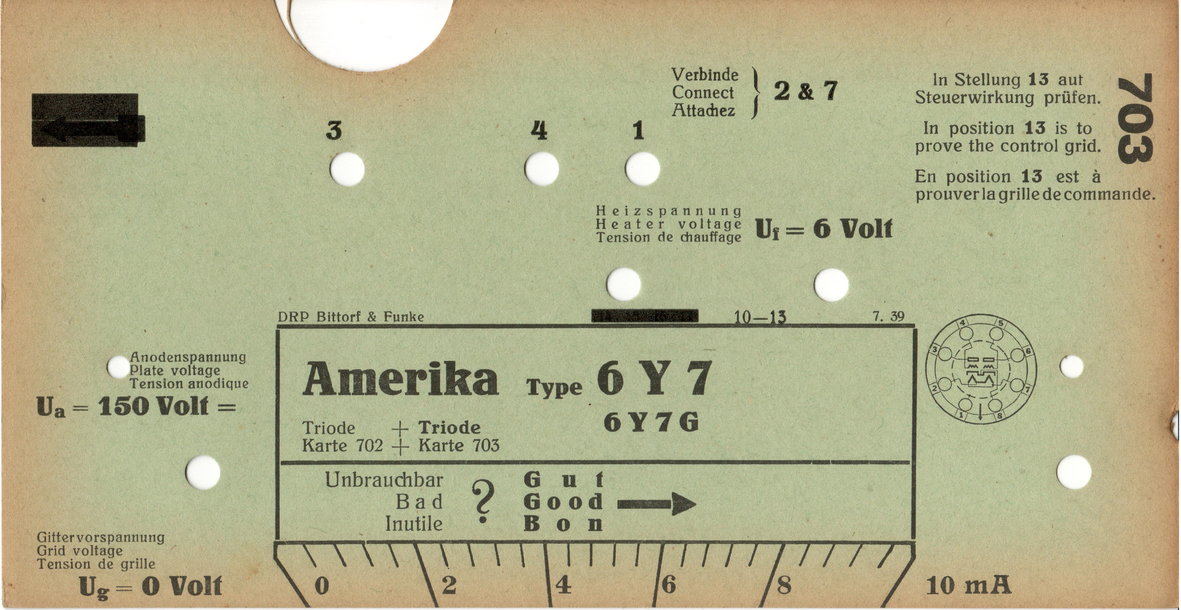 6 Y 7 | 702 + 703 | #1: Funke-Prüfkartenverzeichnis vom 1.3.57 | Amerika-Röhrentypen | |