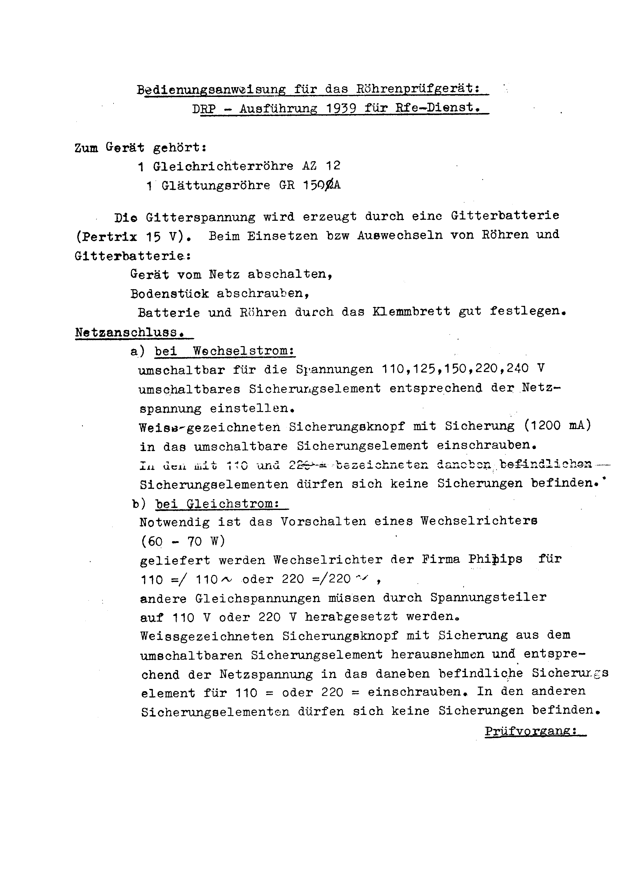 Bedienungsanweisung für das Röhrenprüfgerät: DRP – Ausführung 1939 für Rfe-Dienst.