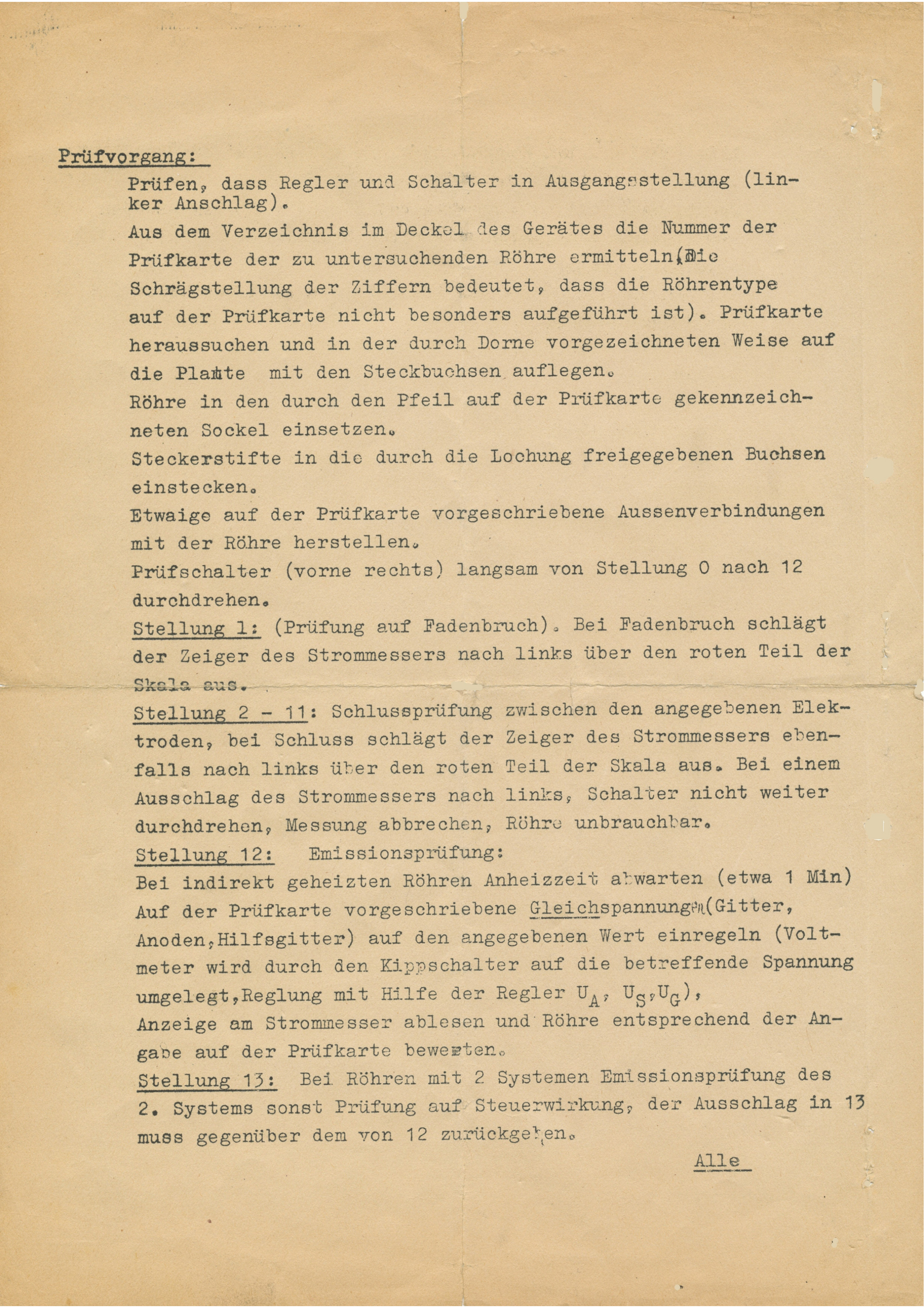 Bedienungsanweisung für das Röhrenprüfgerät: DRP – Ausführung 1939 für Rfe-Dienst.