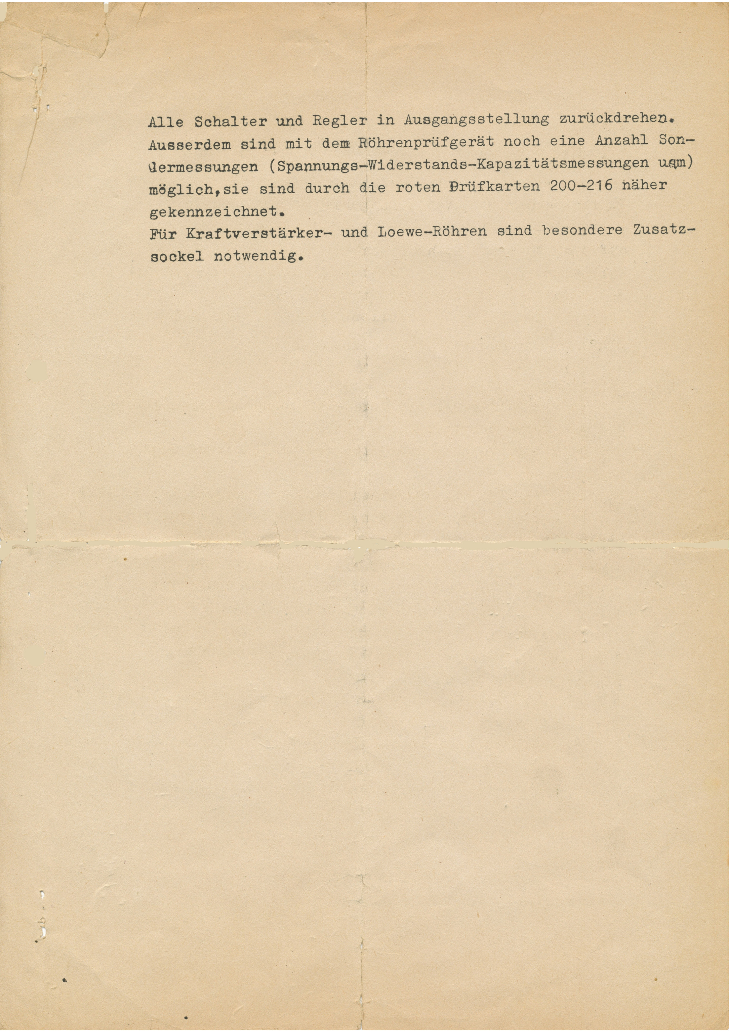 | Titel | Bedienungsanweisung für das Röhrenprüfgerät: DRP – Ausführung 1939 für Rfe-Dienst. |