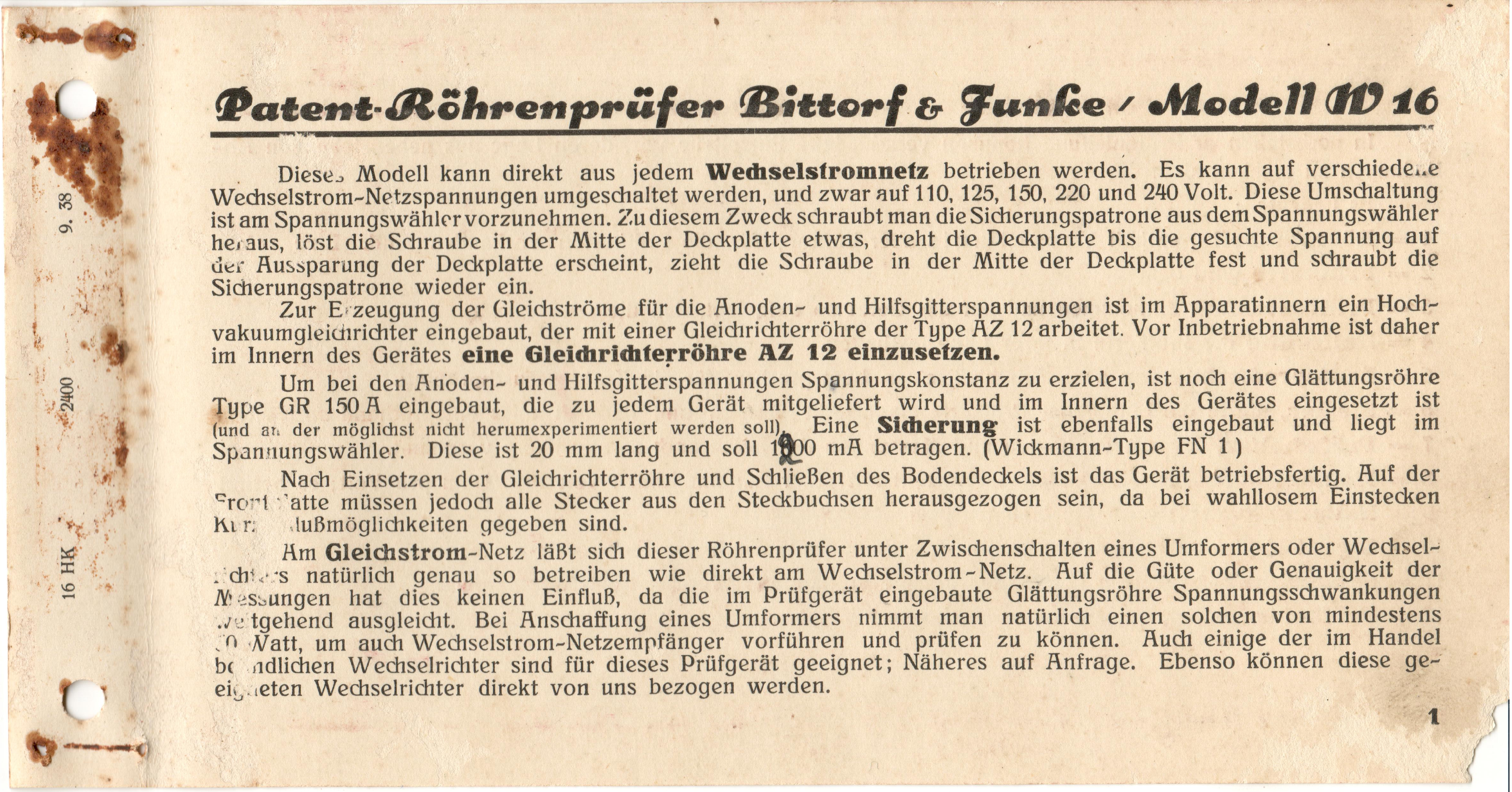 Patent-Röhrenprüfer Bittorf & Funke / Modell W 16